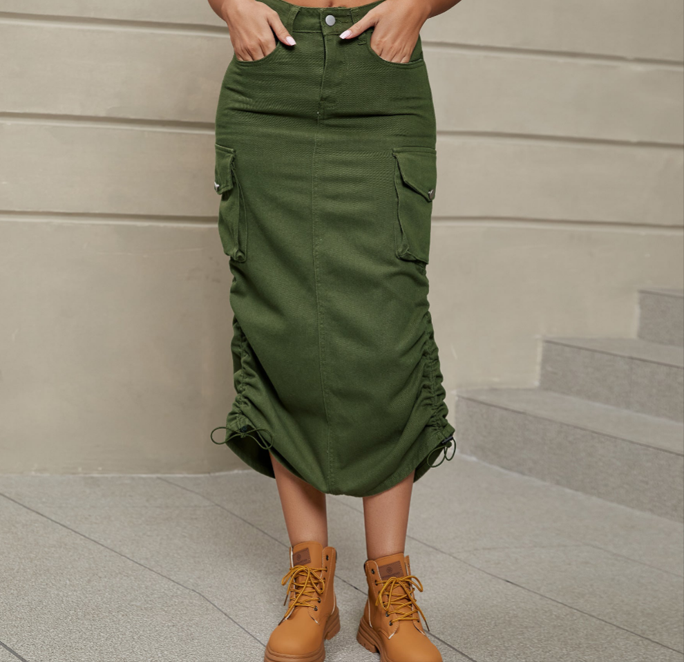 Drawstring Ruched Slit Denim Midi Skirt