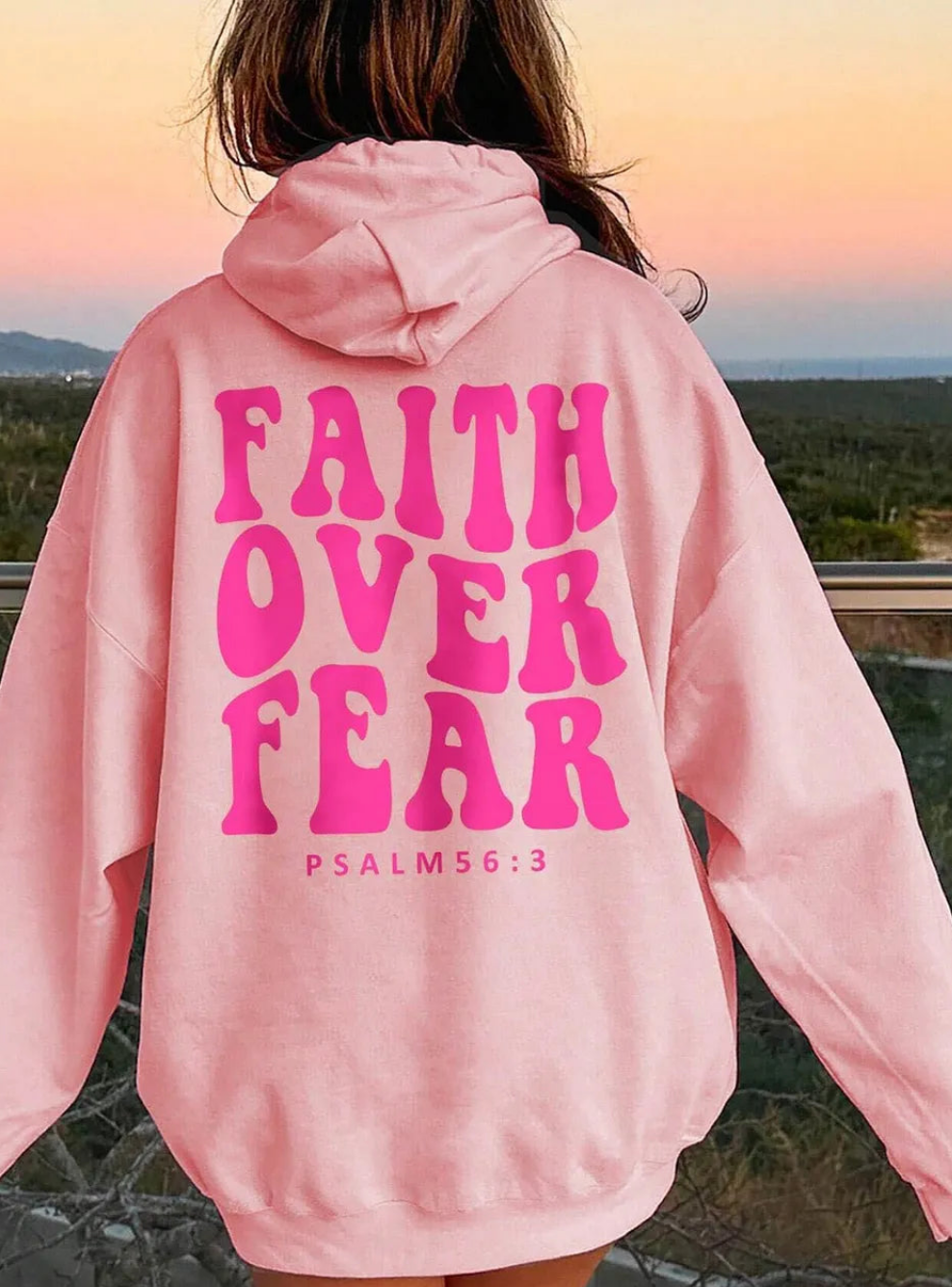 This fashion dropped shoulder hoodie features an inspiring 'FAITH OVER FEAR' message in retro-style typography. Made from soft, comfortable cotton blend material, it combines style with spiritual meaning. The oversized silhouette offers a contemporary casual look while the pink colorway adds a feminine touch. The hoodie includes practical features like a kangaroo pocket, adjustable hood, and ribbed trims. The PSALM56:3 reference adds a meaningful biblical connection, making it perfect for both casual wear and faith expression.